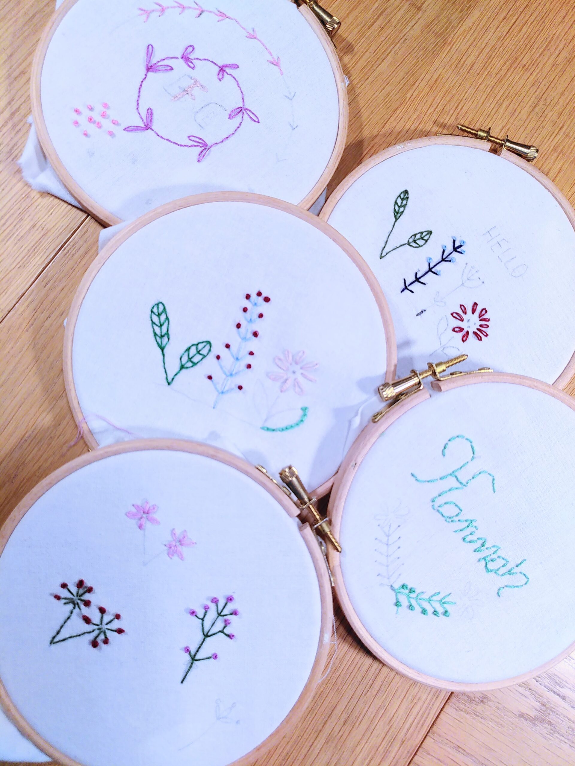 Puis, Lou vous expliquera plusieurs points de base que vous répèterez à l’envie… Tout est fourni pour commencer : tambour, tissu, choix de couleurs de fils à broder.